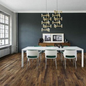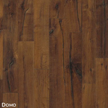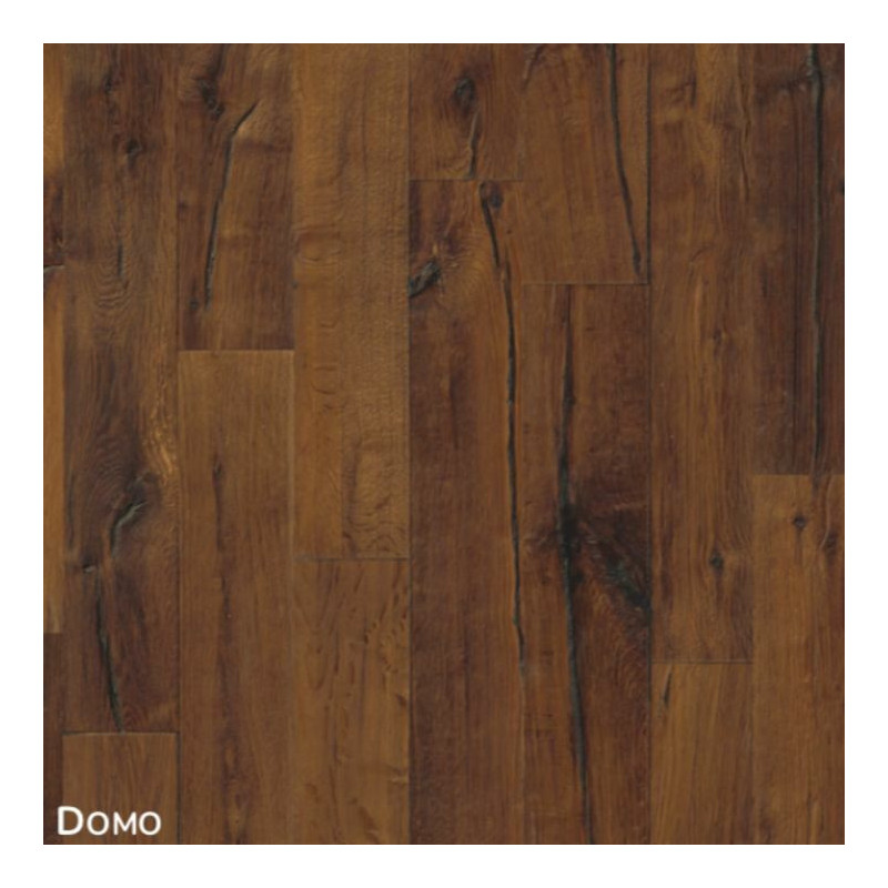 Roble Domo pertenece a la colección Supreme DA CAPO de la marca Kahrs, fabricados con las tablas más limpias. Si quieres un parquet que de una impresión fuerte , esta es tu opción. Este parquet se hace de las tablas con las grietas marcadas, nudos de gran alcance y está teñido en marrón con un aspecto ahumado. Tiene un biselado y labrado en 3D para dar más realismo a su aspecto. Cuenta con un diseño en dos lamas y un tratamiento aceitado y cepillado.